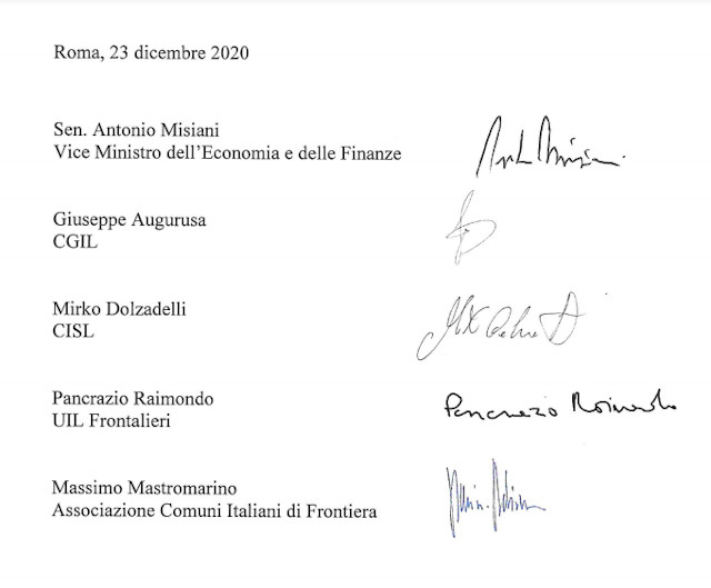 Ad accordo firmato il Governo italiano ha siglato un memorandum con i sindacati Cgil, Cisl, Uil (che hanno avuto il fondamentale sostegno delle organizzazioni sindacali svizzere UNIA, OCST e SYNA). Anche l’associazione dei Comuni di confine è firmataria del memorandum. Nella terza foto troviamo appunto le firme dei contraenti. Notiamo quella di Dolzadelli e di Massimo Mastromarino, sindaco di Lavena Ponte Tresa, per l’associazione dei Comuni di confine.