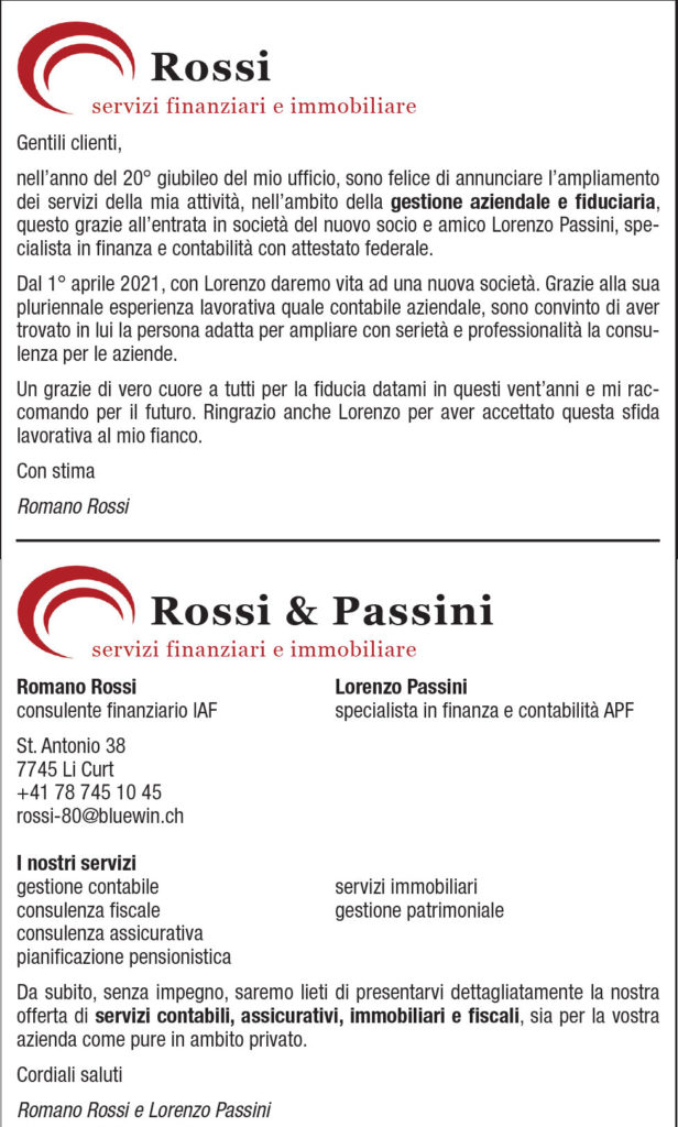 Senza categoria Rossi & Passini: servizi finanziari e immobiliare Ampliamento servizi Di Annuncio pubblicitario - 15 Gennaio 2021 0 1837