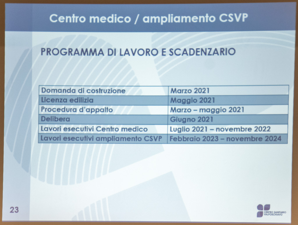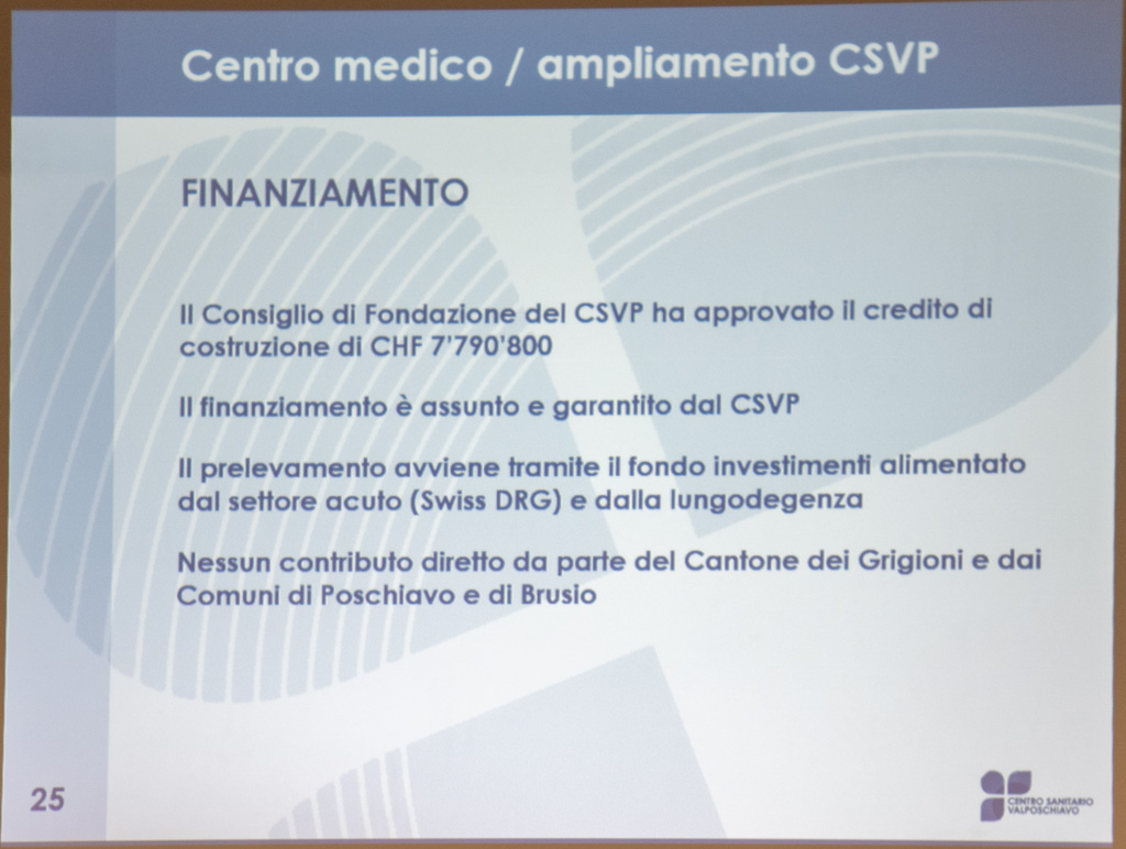 Gabriela Menghini Inauen (UDC), rispetto al concetto esposto, ha sottolineato l’importanza di poter formare dottori in valle. Successivamente ha chiesto se esiste attualmente una prospettiva di evoluzione del fondo di investimento (utilizzato per finanziare l’opera) nei prossimi 10 anni, al fine di prevedere altri sviluppi nel futuro. Guido Badilatti ha rassicurato i presenti circa la consistenza del fondo, in grado di accantonare circa 1 milione all’anno, (sono 12 quelli disponibili al 2020). “Sicuramente – ha annunciato il direttore del CSVP – uno dei prossimi investimenti riguarderà la Casa anziani”.