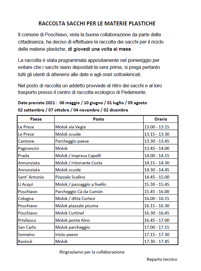 Senza categoria Raccolta sacchi per le materie plastiche Di Comune di Poschiavo - 30 Aprile 2021 0 532