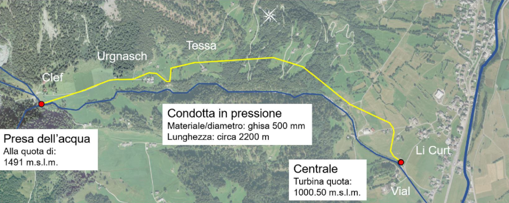 La presa d’acqua è prevista al “Clef”, dopo la confluenza dei tre torrenti di montagna “Val da Quadrada”, “Val Cancian” e “Val da Caral”, ideata per un flusso d’acqua utilizzabile di 500 l/s, per cui almeno 80 l/s o il 35% dell’acqua in entrata deve rimanere nel torrente. La presa d’acqua sarà progettata in modo tale da integrarsi il più discretamente possibile nel paesaggio.