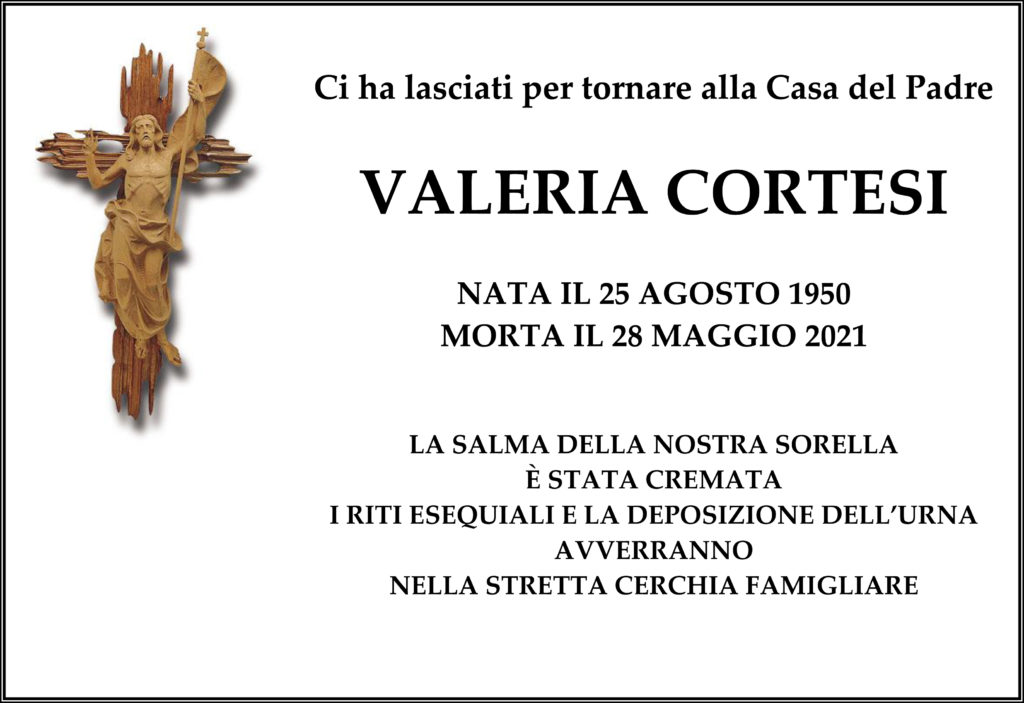 Parrocchia Cattolica San Vittore MauroAnnunci funebri Annuncio funebre: Valeria Cortesi Di Parrocchia Cattolica San Vittore Mauro - 1 Giugno 2021 0 251