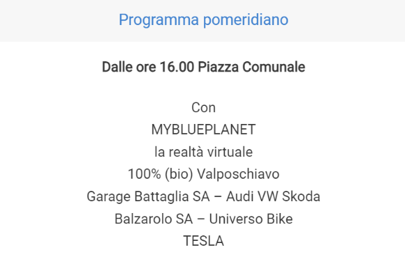 L’8 giugno il ClimaRally di MYBLUEPLANET fa tappa a Poschiavo. Il pomeriggio e la serata saranno dedicati a progetti concreti presenti sul territorio della Valposchiavo. Nel pomeriggio a partire dalle ore 16.00 in Piazza Comunale si potranno provare gratuitamente le e-bike di Balzarolo SA – Universo Bike e le e-auto del Garage Battaglia SA – Audi VW Skoda e di TESLA (riserva qui la prova di una TESLA).