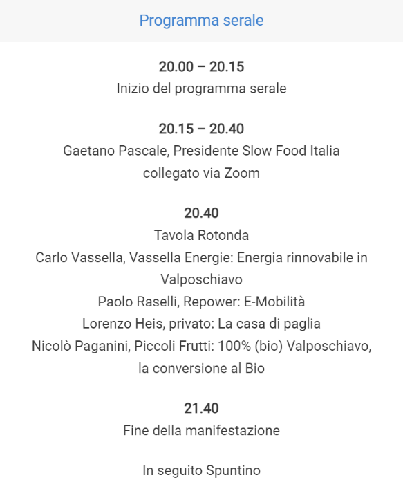 Mentre alle ore 20.00 è in programma in Casa Torre un evento aperto a tutti, durante il quale verranno presentati progetti concreti legati al clima. Inizialmente presenterà Gaetano Pascale, presidente Slow Food Italia, dopodiché verranno presentati quattro progetti made in Valposchiavo presentati da Carlo Vassella, Paolo Raselli, Lorenzo Heis e Nicolò Paganini. Alla relazione e al dibattito farà seguito un rinfresco.
