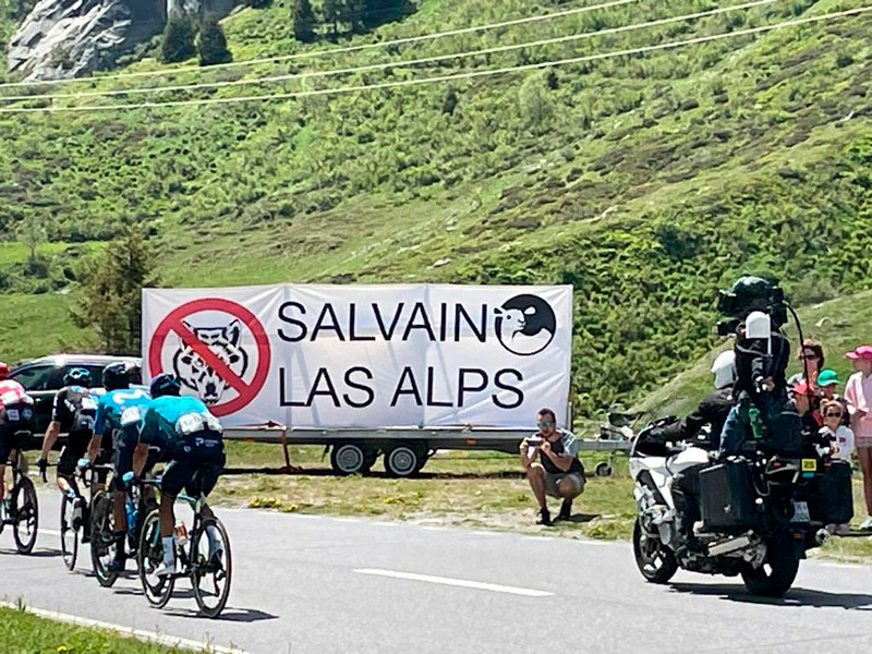Il Tour de Suisse mostra agli spettatori la bellezza del nostro paese. Abbiamo approfittato di quest’occasione per attirare, con un’azione pacifica, l’attenzione dell’opinione pubblica sugli sviluppi spiacevoli del proliferare di questi feroci carnivori. Lungo il percorso nei cantoni Ticino, Vallese, Uri e Grigioni abbiamo reso attenti sulla nostra preoccupazione con lo slogan “Save the Alps – Retten wir die Alpen – Salvain las Alps – Salviamo le Alpi” e con striscioni. La nostra azione di solidarietà è diretta contro la diffusione incontrollata dei grandi predatori, specialmente dei lupi, ancor oggi rigorosamente protetti in tutto l’arco alpino. Questa realtà ha conseguenze devastanti per l’agricoltura alpina, l’alpicoltura, la cultura rurale, la vita di campagna e il turismo.