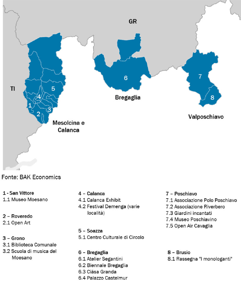 Al di là di questo dato, evidentemente legato alle particolarità del territorio e alla distanza dai centri urbani (come Coira), lo studio sul Grigionitaliano ritrae un settore culturale variegato e in grado di offrire un’offerta di qualità, e sottolinea le potenzialità di regioni in cui sono forti le tracce di grandi personalità della cultura internazionale nate o vissute nelle loro valli.
