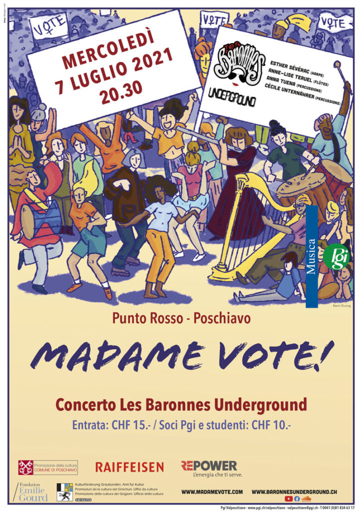 La Pgi Valposchiavo celebra i cinquant’anni del diritto di voto delle donne in Svizzera ospitando Les Baronnes Underground, in tournée per onorare quest’importante traguardo. L’appuntamento è per mercoledì 7 luglio 2021, ore 20.30, presso il Punto Rosso di Poschiavo.