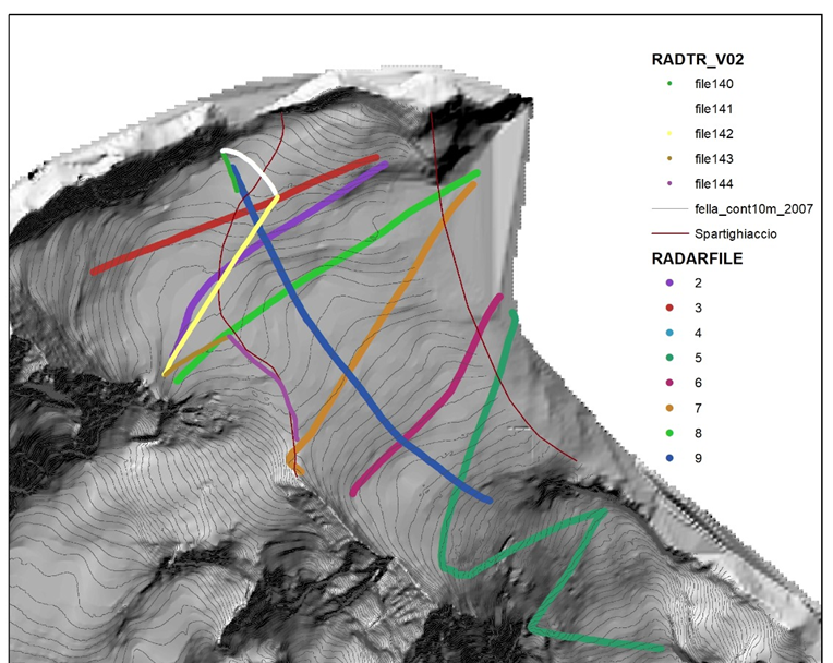 Il ghiacciaio si presenta molto crepacciato e quindi abbiamo dovuto utilizzare l’apposita apparecchiatura radar installata su di un elicottero, mezzo di trasporto che cerchiamo da sempre di utilizzare con estrema parsimonia. Questa terza foto mostra le tracce che abbiamo rilevato. Ora stiamo analizzando i risultati per arrivare a definire con la massima precisione possibile il volume complessivo della massa ghiacciata.