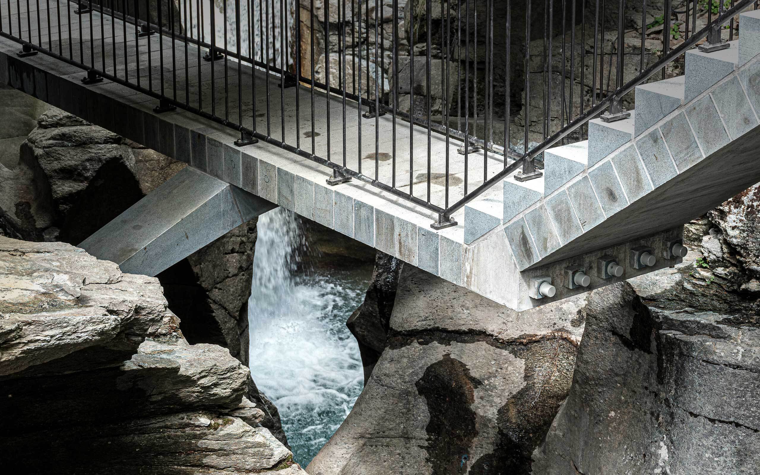 La visita per ammirare una decina di nuove marmitte dei giganti si sviluppa in tutta sicurezza su un dislivello di 35 metri, con un centinaio di gradini e un centinaio di elementi ponte. Il progettoè stato curato dallo studio di ingegneria Conzett Bronzini di Coira.