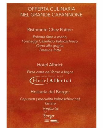L’offerta di bevande regionali ha deliziato i presenti di tutte le età, dagli adulti, ai bambini, passando anche per i giovani in vena di fare festa dopo tutto questo periodo di limitazioni dovute alla pandemia. Per l’occasione sono state proposte le birre della Birreria Poschiavina, i vini della casa vinicola Plozza, la Gasoza Fiorenzana prodotta in modo artigianale in quel di Grono, i succhi di frutta prodotti dall’azienda Piccoli Frutti, i tè e le tisane Raselli, il caffè Keller di Zizers e il rispettivo liquore al caffè, oltre all’immancabile Gin dal’Openair Cavaglia della ditta Misani e alla grappa alla birra di Misani e della Birreria Pacific. In aggiunta anche la cucina ha stuzzicato il palato dei partecipanti, offrendo varie specialità in collaborazione con i ristoratori locali. Dapprima sono stati proposti i famosi “Capunet” preparati dall’Hostaria del Borgo, che ha organizzato inoltre anche una deliziosa tartare di manzo. In alternativa ed in collaborazione con l’Hotel Albrici i presenti hanno potuto gustare anche una prelibata pizza, cotta nel forno a legna e preparata davanti agli occhi dei partecipanti, che si sono gustati la scena e non solo la pizza, con l’acquolina in bocca. Come consuetudine, infine, vi era l’offerta della cucina dell’Openair stesso, che grazie al prezioso aiuto dei nostri aiutanti poteva disporre di una tettoia ben coperta e al riparo dal sole o dalle eventuali intemperie. L’offerta comprendeva i classici hamburger, le salsicce o “lüganghi” in buon dialetto e per finire le bistecche, anch’esse preparate e fornite in modo impeccabile dalla Macelleria Scalino. Le gustose patatine fritte o il tipico “pan da segal” hanno completato i vari piatti usciti dalla nostra cucina, che anche quest’anno è stata molto apprezzata dai presenti. L’offerta del sabato sera inoltre come da tradizione ha visto la preparazione della polenta fatta a mano, accompagnata dal formaggio 100% bio del Caseificio Valposchiavo. Anche in questo caso come per le pizze la preparazione ha suscitato l’interesse degli appassionati, che hanno potuto vedere degli esperti all’opera nella preparazione di questo piatto tipico.