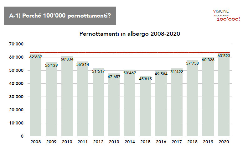 Si nota subito che, a parte una fase iniziale molto forte (2008, 2010), giustificata in parte da eventi legati alla Banca Raiffeisen (2008) e il centenario della Ferrovia Retica (2010), fino al 2015 si è registrata un flessione nei soggiorni in Valposchiavo. Dal 2015, i numeri, invece, hanno mantenuto una crescita costante. Questo può essere visto come un ottimo lavoro svolto da VT (Kaspar Howald ne è diventato direttore nel 2014), anche escludendo il 2020 che è stato, causa Covid-19, un anno eccezionale. Tuttavia non ci si può accontentare di questi risultati perché si può fare molto di più: proprio da qui nasce l’idea che fa prendere vita al progetto Visione Valposchiavo 100’000.