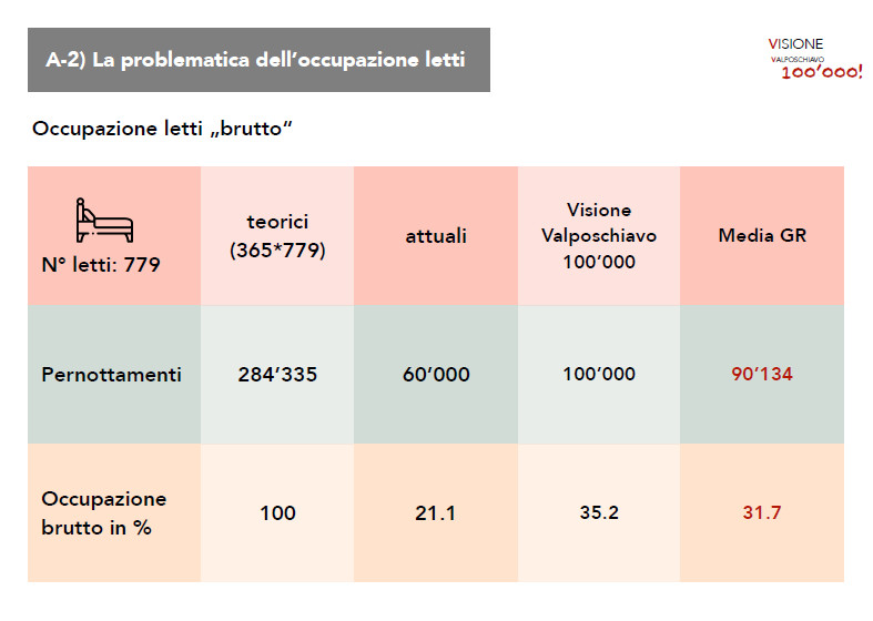 Se questa cifra ci fa scoprire quanto sia il 100% di occupazione totale in Valposchiavo, con i nostri 60’000 pernottamenti nel 2019 (si esclude il 2020 per l’eccezionalità del Covid) raggiungiamo solo il 21,1% di occupazione massima. Visione Valposchiavo 100’000 si propone, con 100’000 pernottamenti annuali, di raggiungere la quota del 35%, che è comunque una percentuale bassa rispetto a quella massima possibile, ma superiore a quella media nel Canton Grigioni che si attesta al 31,7% (per raggiungerla dovremmo avere 90’000 pernottamenti annui).
