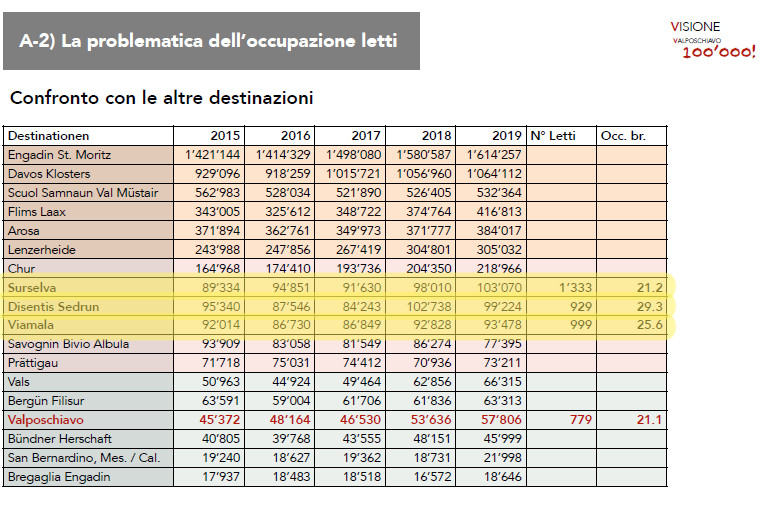 Nella tabella qui sopra vediamo i pernottamenti annuali in alcune della altre località nei Grigioni che, seppure avendo a disposizione un numero maggiore di letti rispetto alla Valposchiavo rapportati all’occupazione massima possibile, sono appena poco superiori percentualmente. L’obiettivo di Visione Valposchiavo 100’000 è anche quello di confrontarsi e raggiungere i numeri di località come Surselva, Disentis Sedrun e Viamala, che vengono considerate turisticamente di fascia media nel Cantone.