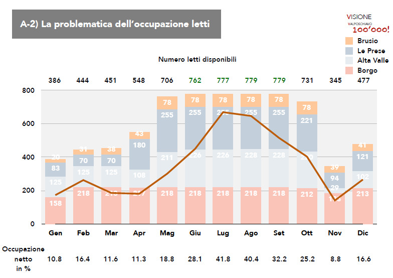 Nell’ultima tabella proposta per questa prima parte di analisi possiamo vedere il grado effettivo di occupazione degli alberghi in Valposchiavo durante tutto l’anno. Come si nota dalla curva arancione, per gran parte dei dodici mesi dell’anno gli alberghi sono occupati molto meno della loro capienza. A esclusione del periodo estivo, da maggio a ottobre, svariati posti letto rimangono vuoti per tutto il resto della stagione e nemmeno nei periodi di maggiore affluenza abbiamo il pienone in tutte le strutture.