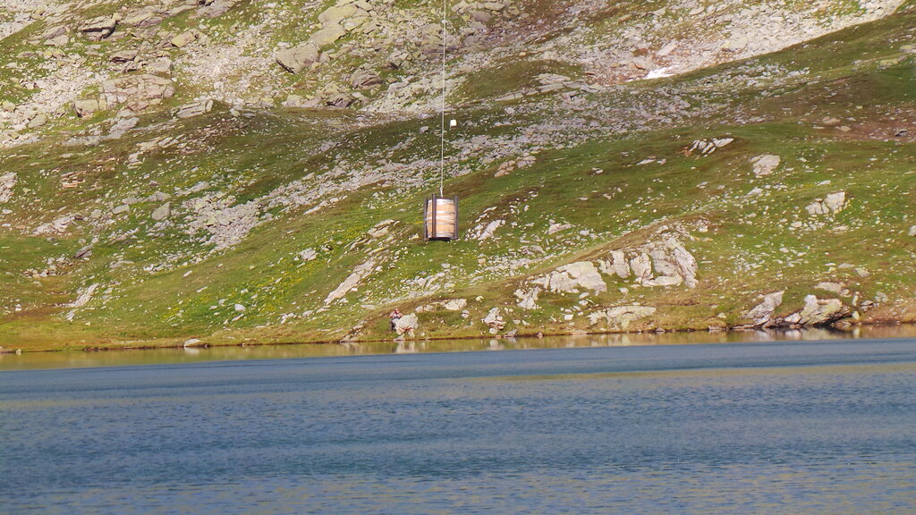 Il castello di ferro, utilizzato per l’elitrasporto, serve da zavorra per tenere il barile sul fondo del lago, avendo la Grappa un peso specifico inferiore all’acqua. Una piccola boa, invece, segnala la posizione della barrique nello specchio d’acqua per favorirne il recupero ad affinamento terminato ed in conformità con quanto richiesto dall’Ufficio Caccia e Pesca. Pietro Misani è consapevole del fatto che non è fattibile raggiungere il lago e spostare il barile per controllare lo stato di affinamento, sia per il peso del bottaccio sia perché il lago per alcuni mesi all’anno è completamente ghiacciato. Per questo,  ha preparato una barrique “gemella” di grappa che maturerà nelle sue cantine, così da poter regolarmente controllare lo stato di avanzamento, senza dover spostare il barile immerso nel lago.