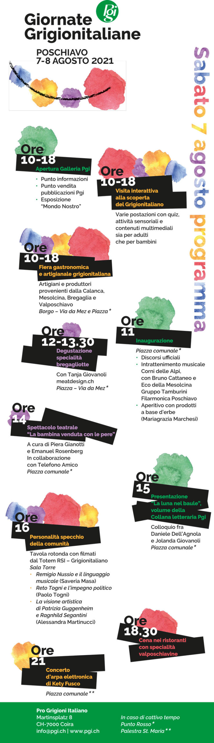 Oltre agli spettacoli teatrali di artisti grigionitaliani, sarà allestito un percorso interattivo e multimediale per scoprire e toccare con mano aspetti della vita nel Grigionitaliano, sia passati che attuali, sia culturali che linguistici; sarà organizzata una tavola rotonda su tre «Personalità specchio della comunità»; ci sarà un prestigioso concerto serale con la talentuosa arpista Kety Fusco e sono in programma altri intrattenimenti con giovani musicisti. Verrà inoltre presentato il nuovo romanzo della Collana letteraria Pgi, scritto da Daniele Dell’Agnola, in coedizione con Armando Dadò, tradotto in tedesco e romancio, e arricchito da un apparato didattico.