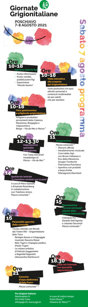 L’evento punta a essere motivo di incontro e condivisione fra calanchini, mesolcinesi, bregagliotti e valposchiavini, nonché tra grigionitaliani che abitano lontani dai territori d’origine. Dati i numerosi appuntamenti e le diverse proposte vi invitiamo a scaricare la locandina e consultare il programma sul sito della Pro Grigioni Italiano alla pagina dedicata (www.pgi.ch/ggi2021) e sui canali social media (Facebook, Instagram, Twitter).