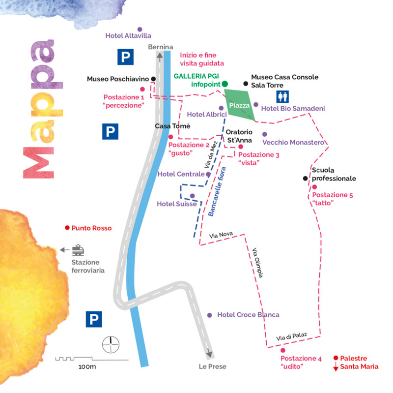 Per orientarsi nel borgo di Poschiavo è disponibile una mappa che raffigura i diversi punti focali della manifestazione e della visita guidata interattiva e sensoriale alla scoperta del Grigionitaliano che conta lungo il percorso 5 postazioni. Prima di partecipare alle diverse offerte invitiamo inoltre gli iscritti e gli interessati a recarsi in Galleria Pgi, affacciata sulla piazza principale, lasciare i propri dati di contatto e ritirare la cartolina valida come biglietto d’ingresso al Museo Poschiavino e a tutti gli spettacoli in programma, compreso il momento inaugurale ufficiale. La Galleria Pgi è anche punto informazioni, partenza del percorso suddetto, libreria e luogo dell’esposizione “Mondo nostro”, riproposta dopo l’evento a Grono del 22 e 23 maggio 2021.