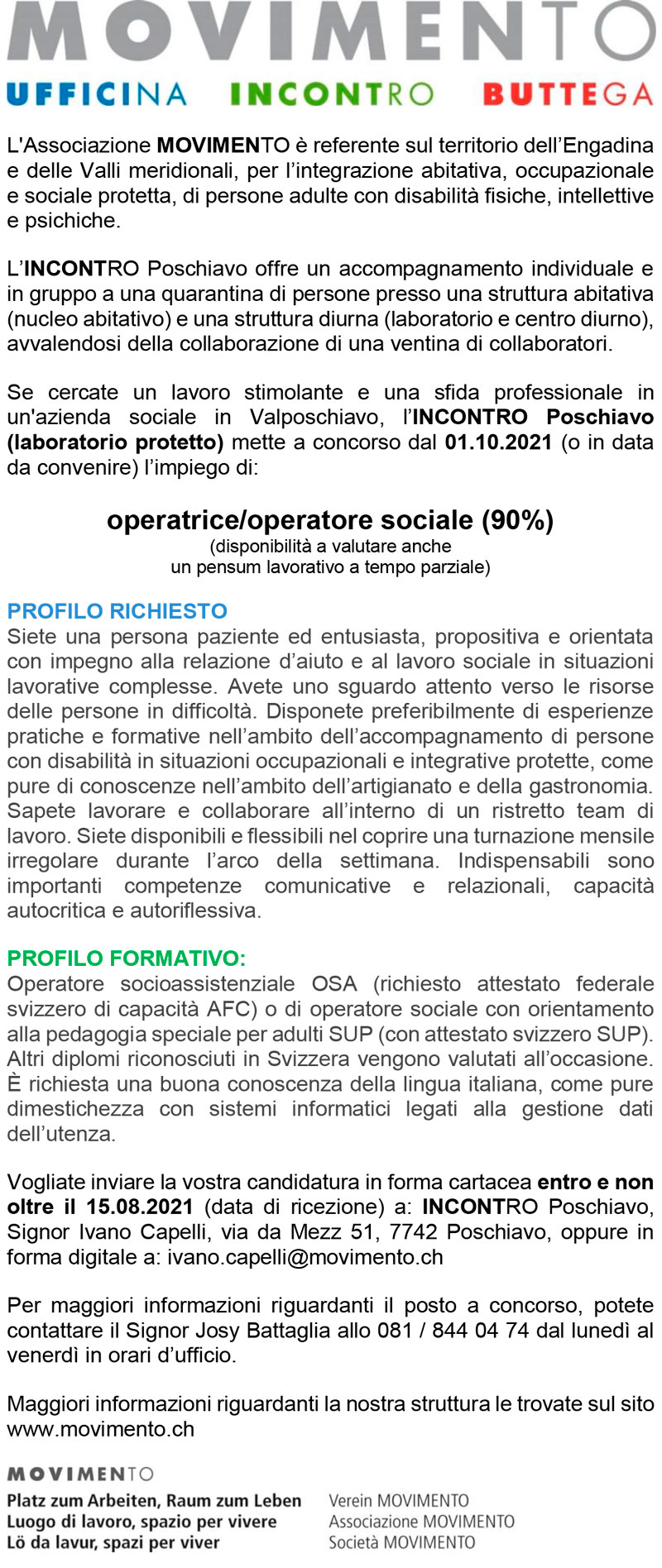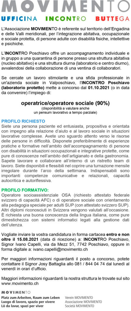 Senza categoria INCONTRO cerca operatrice/operatore sociale Di Annuncio pubblicitario - 3 Agosto 2021 0 696