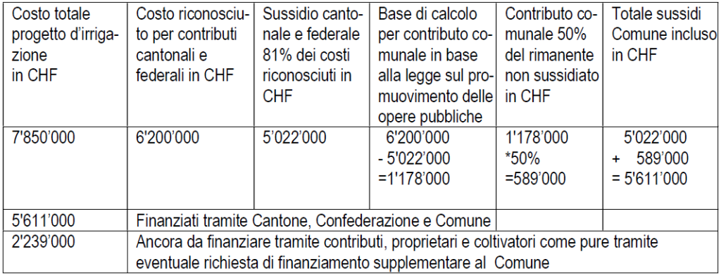 “Contrariamente a quanto esposto nella presa di posizione per la riunione della Giunta del 5 ottobre 2021, – è stato spiegato – la partecipazione comunale in base alla legge sul promovimento delle opere pubbliche non è di CHF 1.7 milioni, ma CHF 0.6 milioni. A questi vanno aggiunti i contributi che il Comune sarebbe chiamato a pagare quale proprietario di alcune particelle. Un’ulteriore richiesta di finanziamento pubblico per coprire i restanti CHF 2’239’000 da parte del Consorzio Bonifica Fondiaria non è da escludere. Questo eventuale finanziamento non è da ritenere vincolato e pertanto sottostà all’approvazione della Giunta rispettivamente del popolo in base alle competenze finanziarie fissate nella costituzione. Va inoltre ricordato, che l’impianto d’irrigazione, qualora non venisse realizzata la centralina Val Pednal o il popolo non dovesse approvarne la concessione, necessiterà di una concessione. Tale concessione sarà da sottoporre al popolo per l’approvazione”.