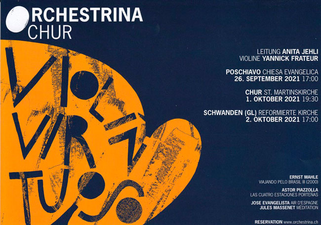 Domenica 26 settembre 2021 alle ore 17.00, presso la chiesa evangelica di Poschiavo, avrà luogo il concerto «ORCHESTRINACHUR & violin virtuoso».