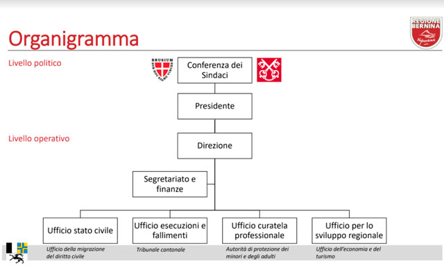 Come spiegato dal presidente di Giunta Fulvio Betti, la Regione Bernina è un ente di diritto pubblico cantonale con personalità giuridica propria. L’organo principale, oltre agli abitanti della Valposchiavo aventi diritto di voto, è la conferenza dei sindaci. Essa è composta dal Presidente del comune di Brusio, dal podestà di Poschiavo e, per ciascun Comune, da un ulteriore membro del Consiglio comunale.