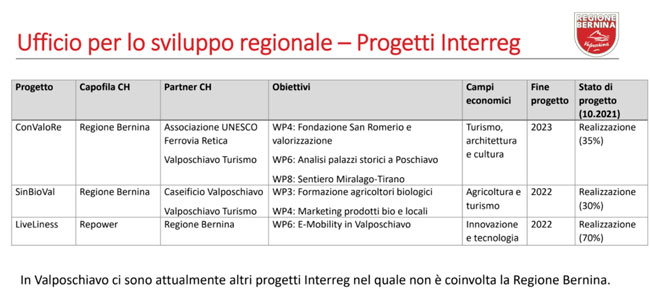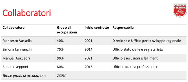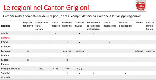 Il punto di debolezza principale – è stato spiegato – riguarda prevalentemente le piccole dimensioni della regione stessa, mentre le attuali minacce alla sua esistenza e alla messa in pratica delle sue funzioni sono uno sviluppo negativo della popolazione con una conseguente diminuzione di richiesta dei servizi. Vassella ha concluso il proprio intervento con la propria visione dell’ente, un concetto che è servito anche come motivazione per la presa in carico del ruolo: “La Regione Bernina è un terreno fertile per le collaborazioni intercomunali e un’opportunità per lo sviluppo della Valposchiavo. Sta ai comuni capire come sviluppare questa opportunità”.