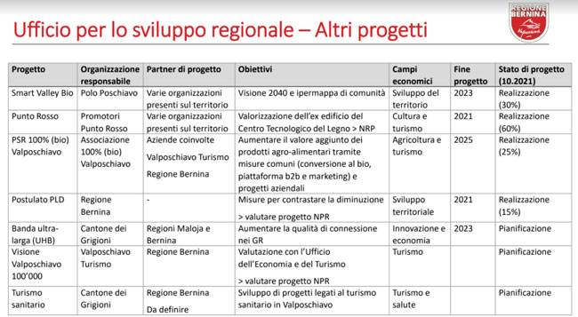In merito all’Ufficio per lo sviluppo regionale (i cui compiti sono: sostegno dei progetti che mirano a valorizzare potenziali economici e di conseguenza a incrementare in maniera sostenibile la concorrenzialità della regione, a creare posti di lavoro e a produrre valore aggiunto; attuazione della «Nuova politica regionale della Confederazione e del Cantone dei Grigioni (NPR)»; promozione, gestione e accompagnamento di progetti di sviluppo regionale; coordinamento con le attività di altri attori locali; commissione dei Marchi) gli obiettivi per il 2022 sono sviluppare, in collaborazione con gli attori dell’agricoltura, dell’economia, del turismo, delle formazione e della politica vallerana, una strategia regionale di sviluppo della piazza economica.