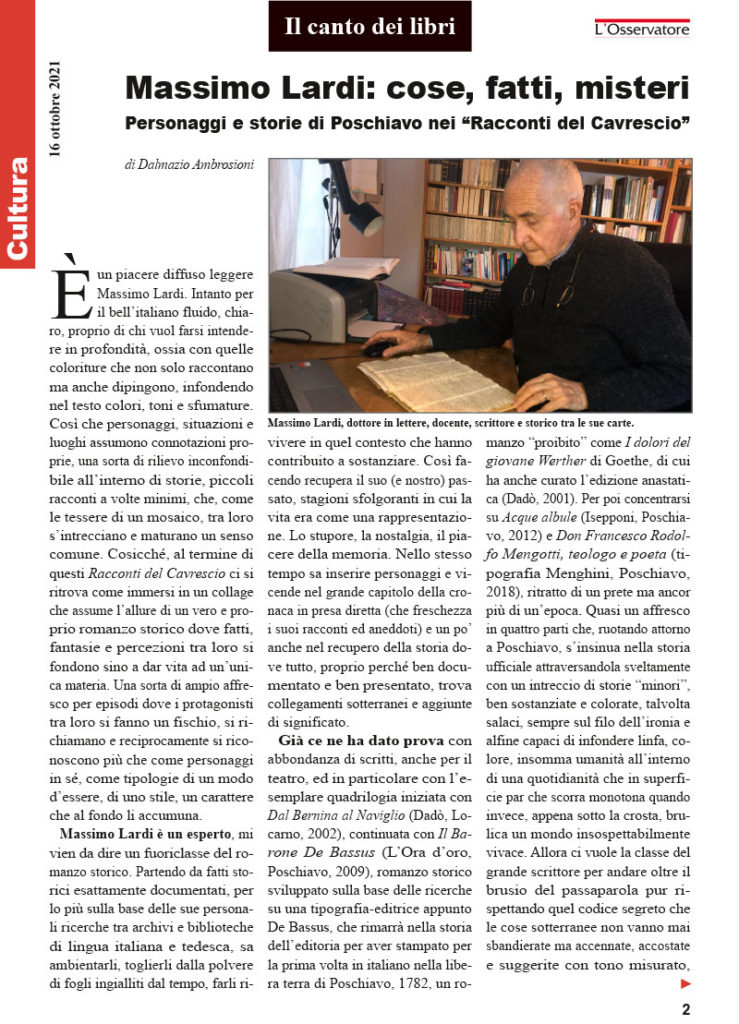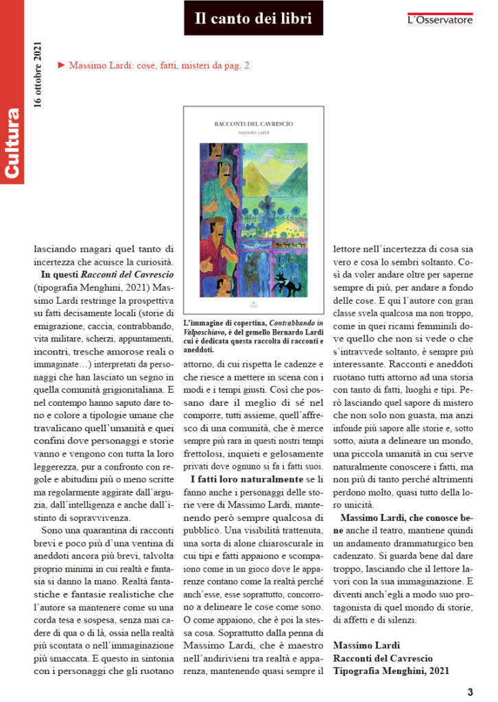 In vista della presentazione della raccolta «Racconti del Cavrescio» di sabato 6 novembre 2021, alle ore 16.00, presso l’Hotel La Romantica di Le Prese, la Pgi Valposchiavo propone la recente recensione del giornalista Dalmazio Ambrosioni, apparsa il 16 ottobre 2021 sulla rivista online «L’Osservatore». Ringraziamo l’autore e la testata per la gentile concessione.