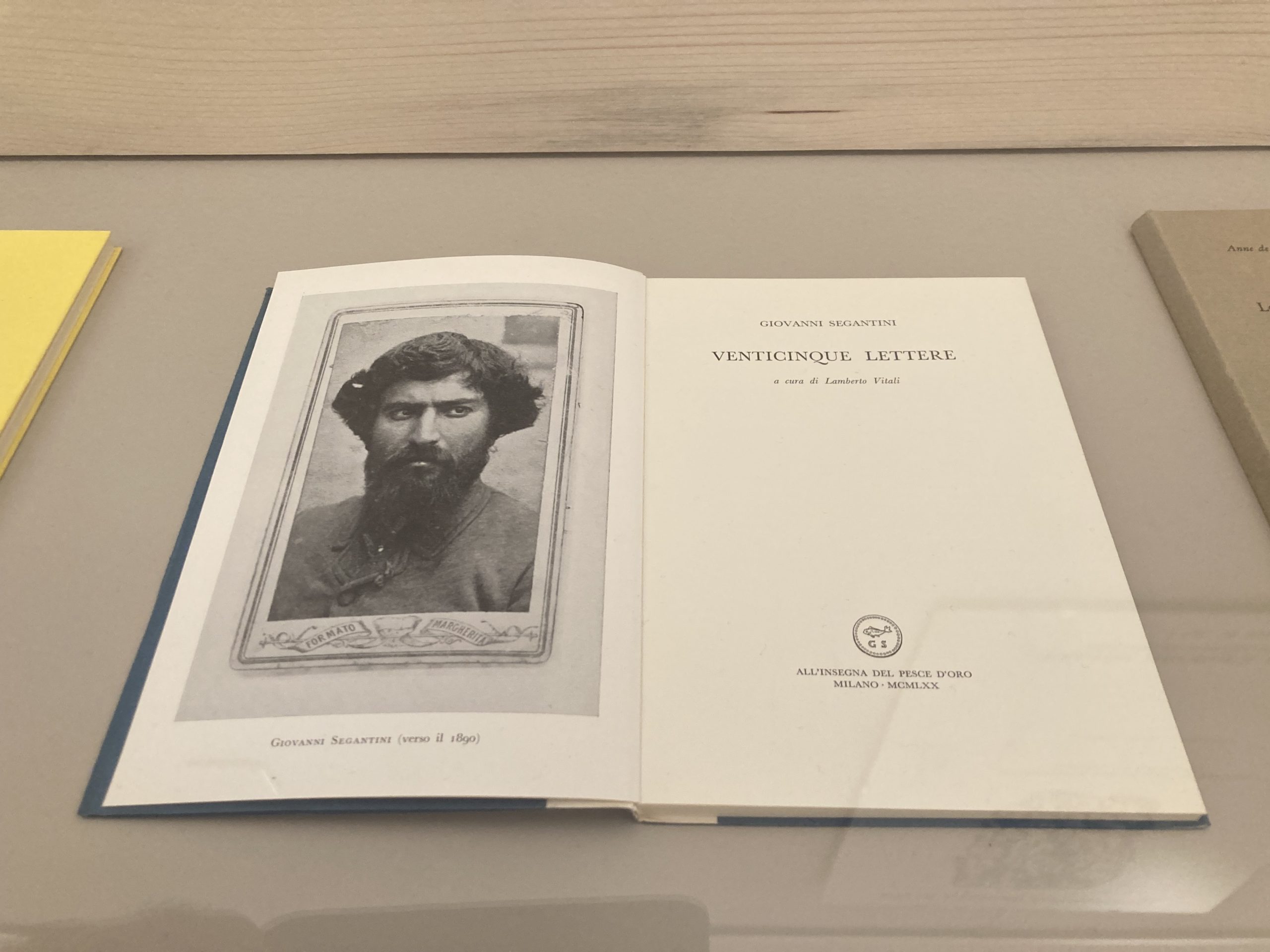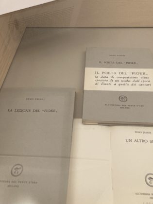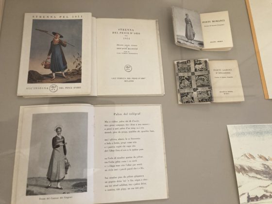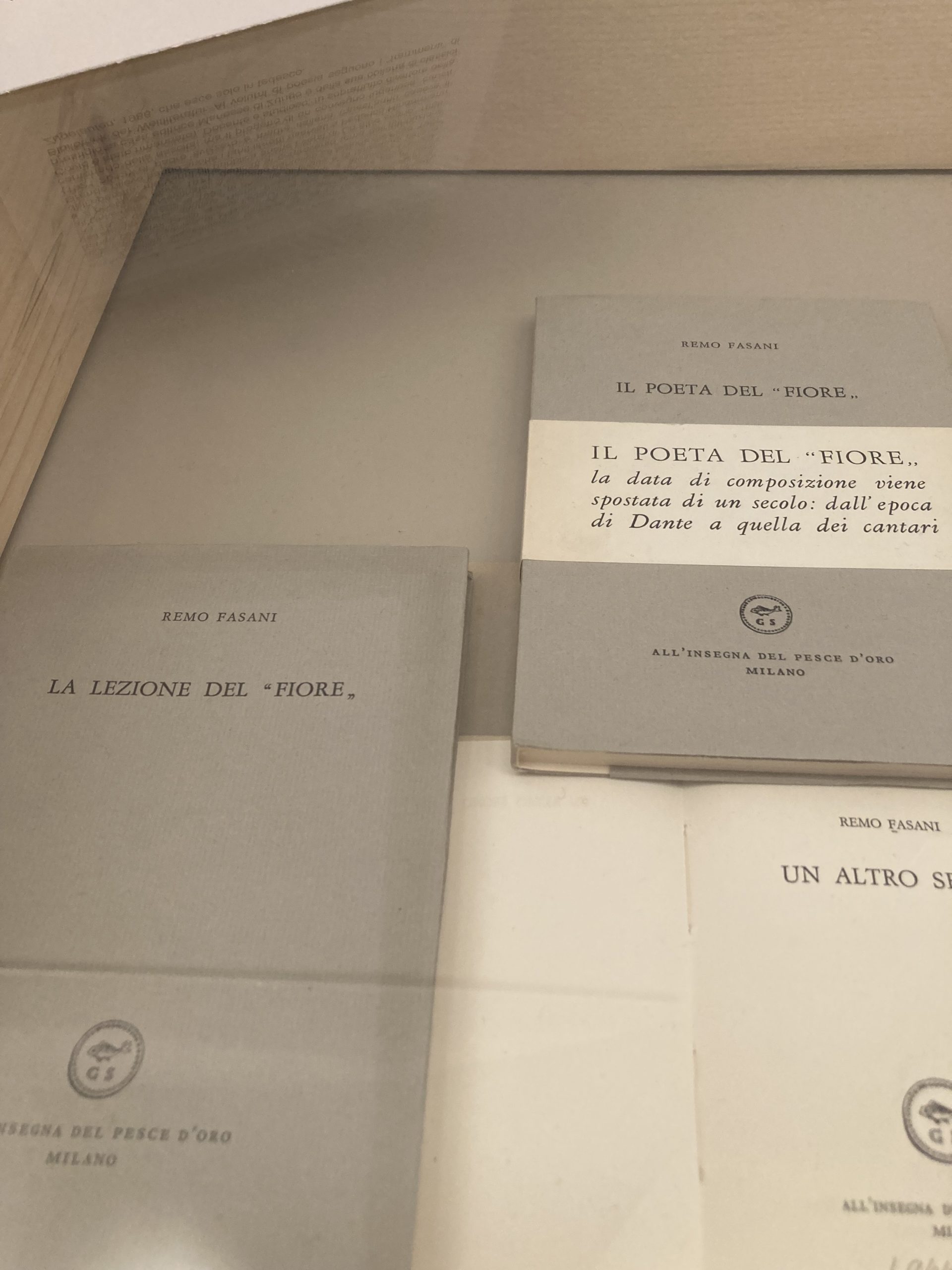 Questo il motivo per cui alla mostra si trovano libri di importanti poeti del Novecento pubblicati nella collana «All’insegna del pesce d’oro»: Giovanni e Giorgio Orelli, Francesco Chiesa, Philippe Jaccottet, Federico Hindermann e anche il grigionitaliano Remo Fasani, di cui si propone una breve raccolta (Un altro segno, 1965) e due saggi sul caso letterario del poemetto Il Fiore (La lezione del «Fiore», 1967, e Il poeta del «Fiore», 1971). Inoltre compare la raccolta di Venticinque lettere (1970) scritte da Giovanni Segantini e curate per l’edizione da Lamberto Vitali.