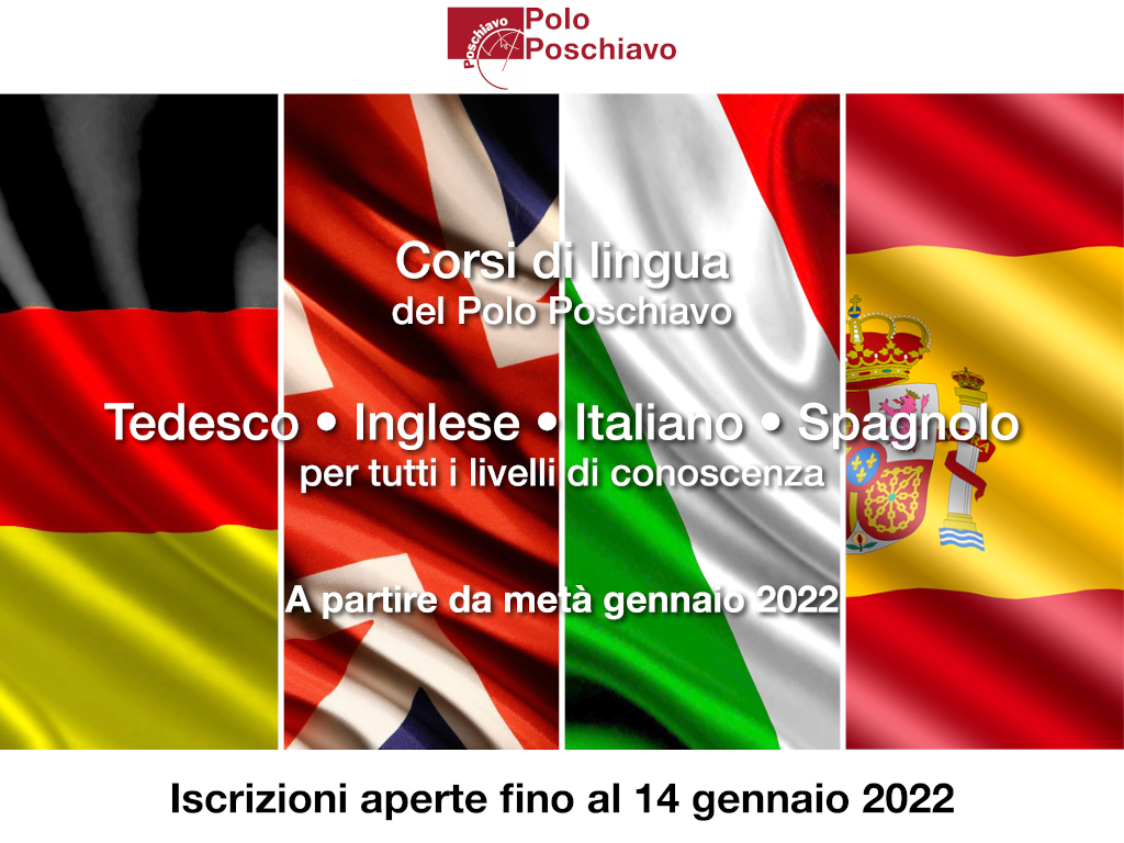 Abbiamo il piacere di informare che a partire da metà gennaio 2022, il Polo Poschiavo prevede come di consueto corsi di tedesco, inglese, italiano e spagnolo per vari livelli di conoscenza della lingua che verranno effettuati da docenti note ed affermate in Valposchiavo.