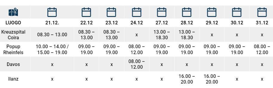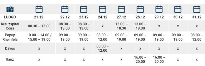 Gli orari di apertura degli altri centri di vaccinazione a Thusis, St. Moritz, Schiers, Ilanz, Davos, Poschiavo e Grono sono consultabili all’indirizzo www.gr.ch/impfen. I centri di vaccinazione rimarranno chiusi il 25 e il 26 dicembre.