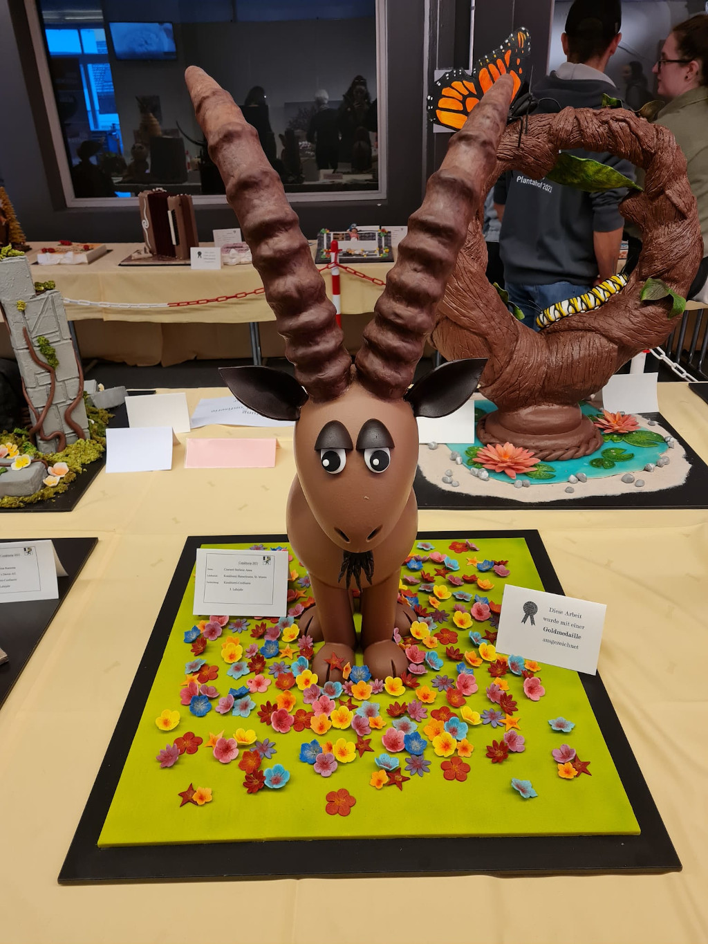 Diciamo che ha richiesto svariate ore di lavoro. Il corpo è realizzato con il cioccolato fondente nero, che è più resistente del cioccolato al latte. Questo mi è servito per sistemare dei sostegni di cioccolato per dare forma allo stambecco. Il vero problema è stato il trasporto fino a Coira, per non farlo andare in pezzi mio padre ha dovuto andare molto piano e fare moltissima attenzione; in questo caso mi sarebbe piaciuto essere uno di quei concorrenti che abita a 5 minuti da Coira.