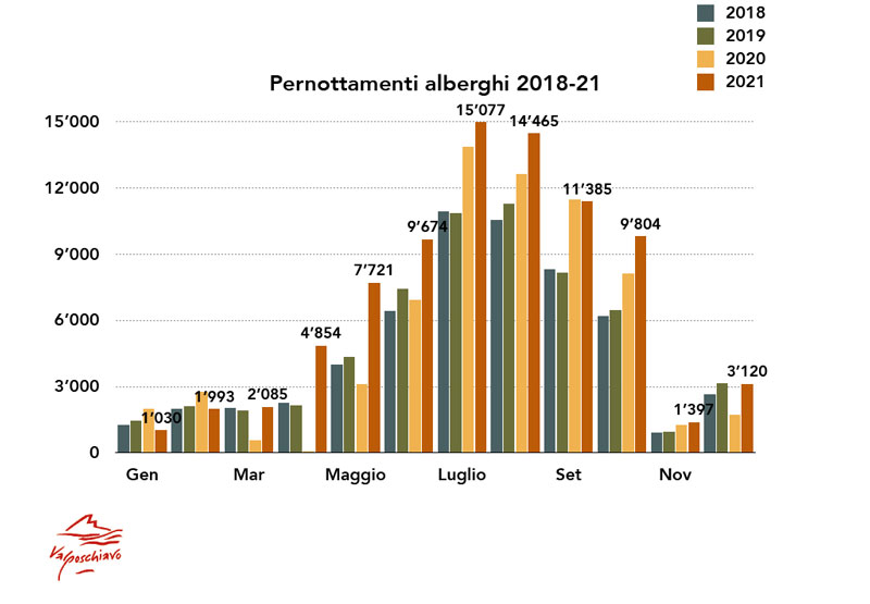 L’apprezzamento della Valposchiavo da parte di enti e organizzazioni si riflette e trova conferma nell’affluenza degli ospiti. Per il sesto anno consecutivo i pernottamenti registrati presso le strutture alberghiere della valle sono in aumento. Dal 2015 in poi sono cresciuti con una media di ca. 7% all’anno. Mentre nel 2021, con un totale di 83’821 pernottamenti, rispetto al 2020 la crescita è stata di quasi il 30%, ossia ca. 20’000 pernottamenti.