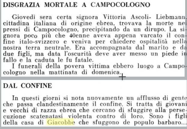 Il Grigione Italiano del successivo 8 dicembre pubblicò un trafiletto sulla disgrazia (vedi foto sotto). Molto interessanti, immediatamente sotto, le cinque righe. Si parla dei “figli della casa di Giacobbe”, quindi degli ebrei, “che sfuggono de populo barbaro”. “De populo” non è un errore perché il redattore sapeva il fatto suo, ma semplicemente una citazione latina: esattamente del Salmo 114 (recitato anche nel momento culminante del Seder, la Pasqua ebraica). Ma anche di Dante che nella Divina Commedia pone quest’inno sulle labbra delle anime del Purgatorio: «In exitu Israël de Aegypto / cantavan tutti insieme ad una voce…» (Purgatorio II, 46-47). Il salmo biblico, nel suo insieme, è un canto gioioso e trionfale che evoca l’esodo di Israele dall’oppressione degli egizi. Da ultimo: il redattore parla apertamente di persecuzione violenta perpetrata nei confronti degli ebrei “oggi” (nel ’43) da un popolo barbaro (chiaramente i nazifascisti).