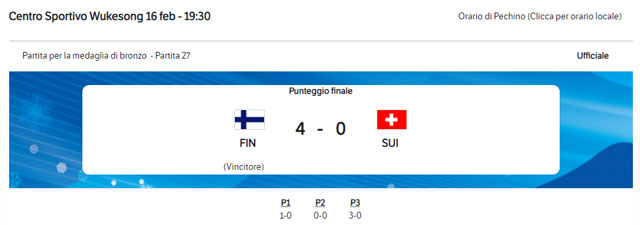 Epilogo amaro per le rossocrociate che, purtroppo, non riescono a bissare il risultato delle olimpiadi di Sochi del 2014. Una Finlandia compatta e concreta ha conquistato il terzo posto con le reti della Vainikka nel primo tempo e le successive tutte nel terzo (a segno Tapani, Laitinen e Karvinen).