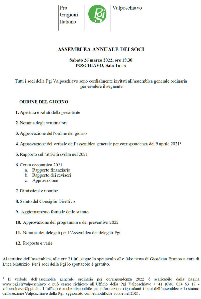 Senza categoria Assemblea della Pgi Valposchiavo /Odg Sabato 26 marzo Di Il Bernina - 10 Marzo 2022 0 114