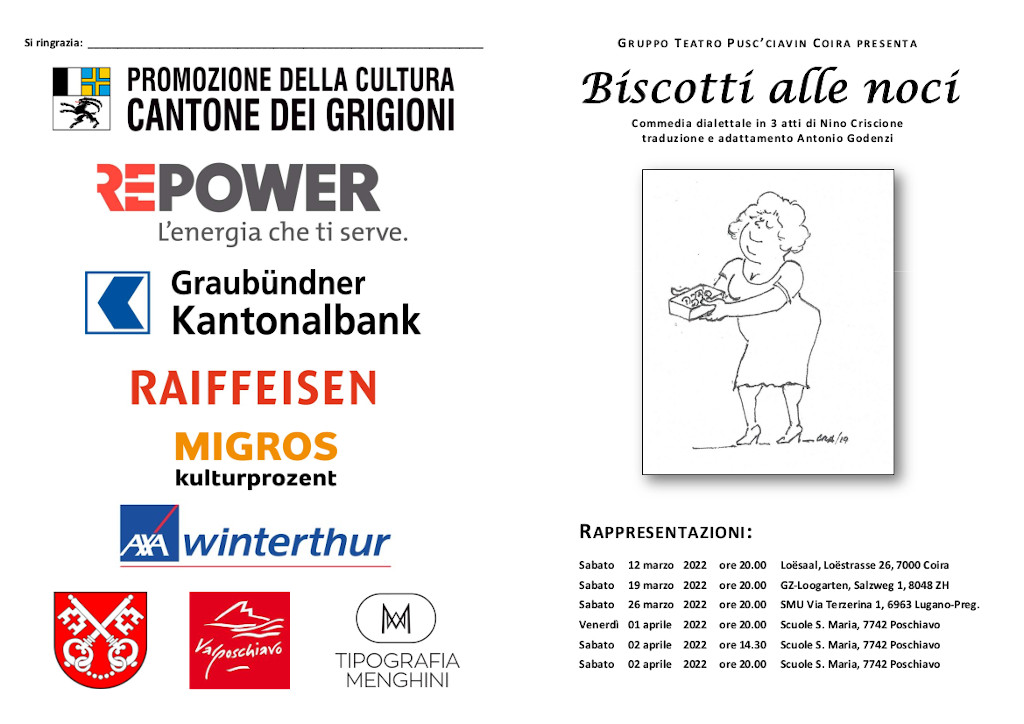 Interpretata dai Pusc’ciavin da Coira, la Commedia dialettale in 3 atti di Nino Criscione con traduzione e adattamento di Antonio Godenzi dal titolo “Biscotti alle noci”, arriverà a Poschiavo i primi due giorni di aprile.