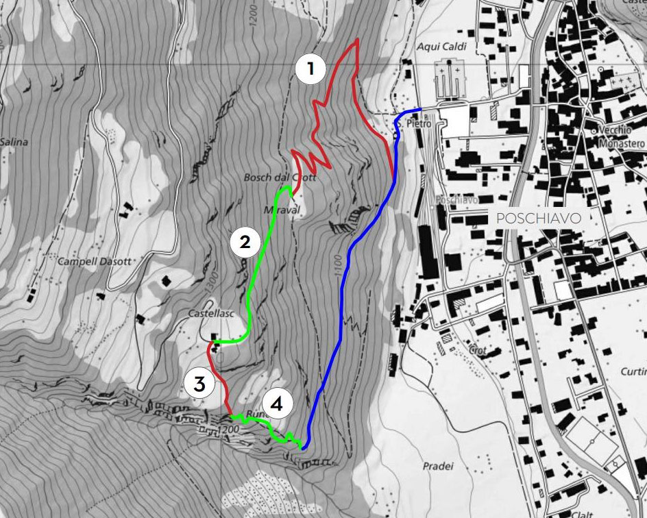 L’Associazione “Il Risveglio”, dopo aver fatto un primo test d’intervento sul sentiero che dalla chiesa di “S. Pieru” porta a “Castelasc” ed effettuato una stima dei costi per gli interventi sul sentiero in oggetto, ha chiesto al comune di Poschiavo un contributo finanziario per la sua realizzazione (l’amministrazione aveva già dimostrato il suo apprezzamento per il progetto preliminare con un contributo di CHF 5’000).