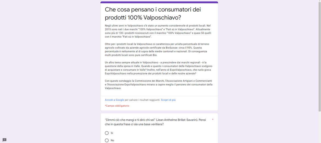 Con questo sondaggio la Commissione dei Marchi, l’Associazione Artigiani e Commercianti e l’Associazione ExpoValposchiavo mirano a capire meglio il pensiero dei consumatori della Valposchiavo.