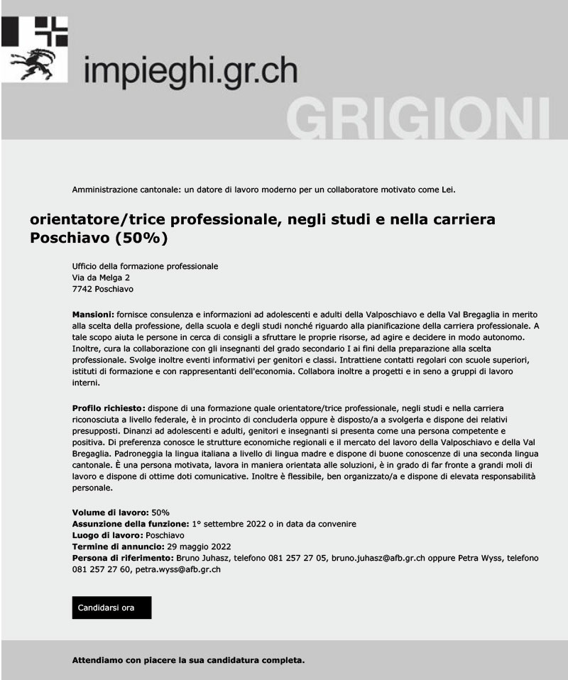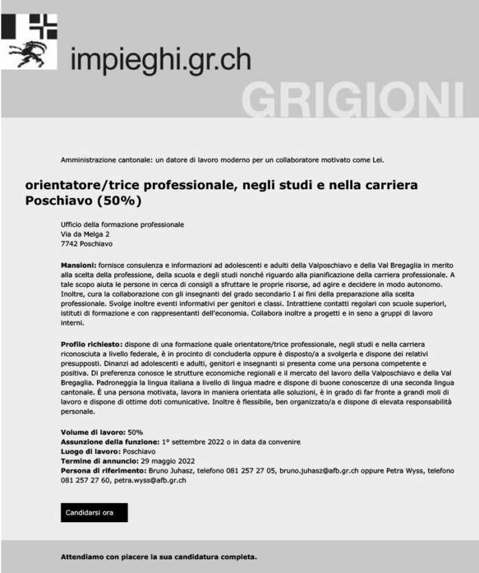 Senza categoria Orientatore/trice professionale, negli studi e nella carriera Poschiavo (50%) Di Annuncio pubblicitario - 11 Maggio 2022 0 905 Clicca qui per scaricare il pdf Clicca qui per accedere all’annuncio online