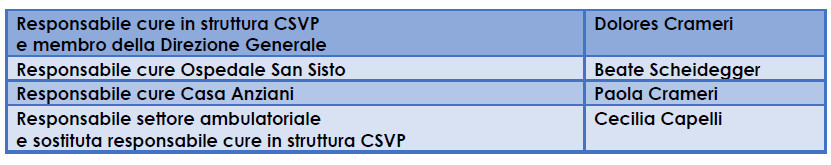 Il nuovo assetto delle cure, rinominato “Cure in struttura CSVP”, è composto da “Cure Ospedale San Sisto, Cure Casa Anziani e Settore ambulatoriale.” La responsabile cure in struttura CSVP e le responsabili di settore formano assieme la Conferenza delle Cure, di cui riportiamo i nominativi: