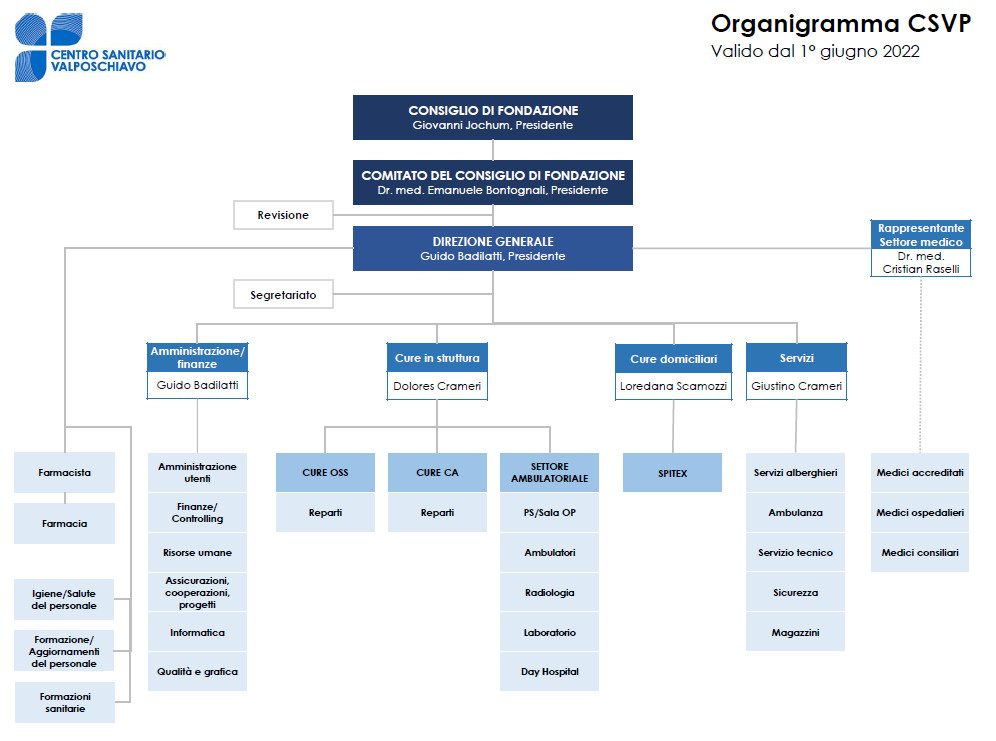 Lo scorso 1° giugno 2022 è entrato in vigore il nuovo organigramma del CSVP, rielaborato per migliorare l’efficienza sulla scorta dell’esperienza acquisita nei primi anni d’attività dalla fusione tra l’Ospedale San Sisto, la Casa Anziani e la Spitex.
