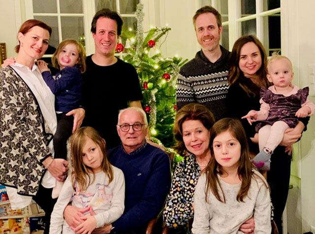 Mario Giovanoli, l’autore di „Im Labyrinth der Bündner Täler“, con la consorte Brigitte Cosandier e le famiglie dei loro due figli (2018)