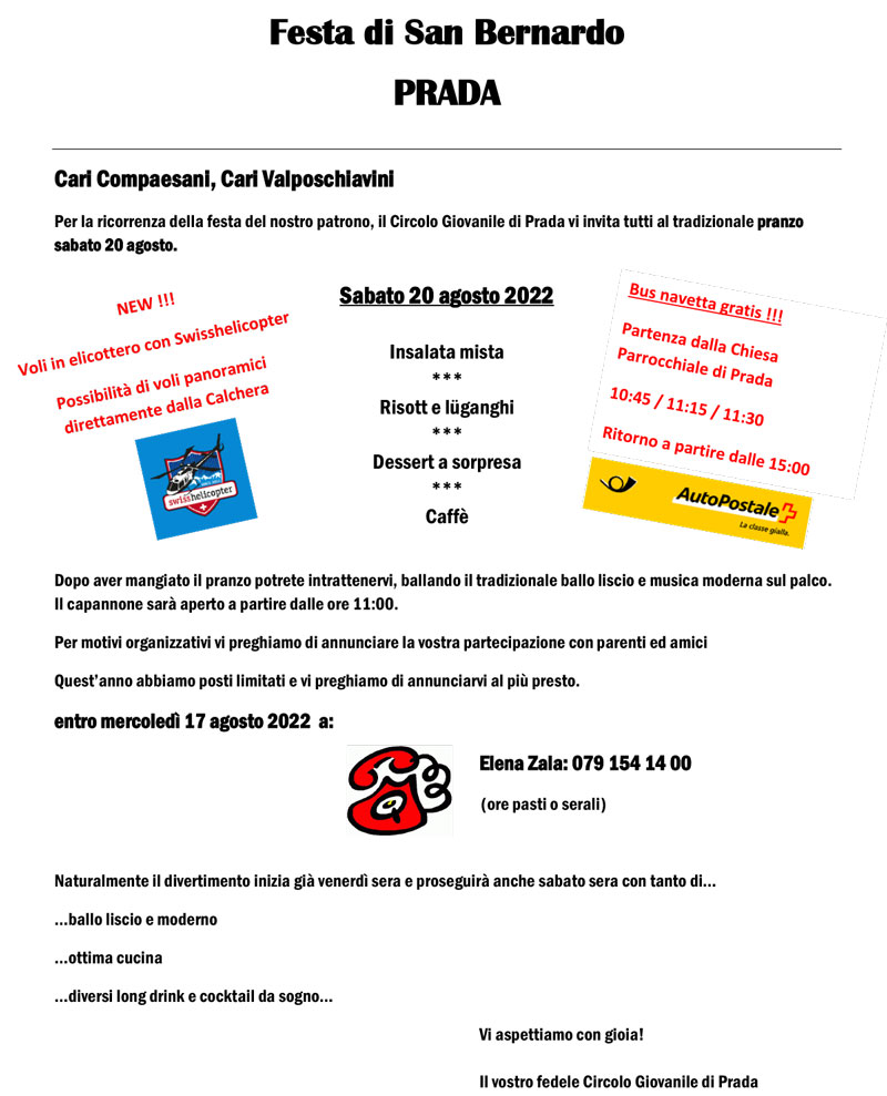 Dalle 11.00 in poi, a Prada, la Festa di San Bernardo con il pranzo organizzato dal Circolo Giovanile di Prada.
