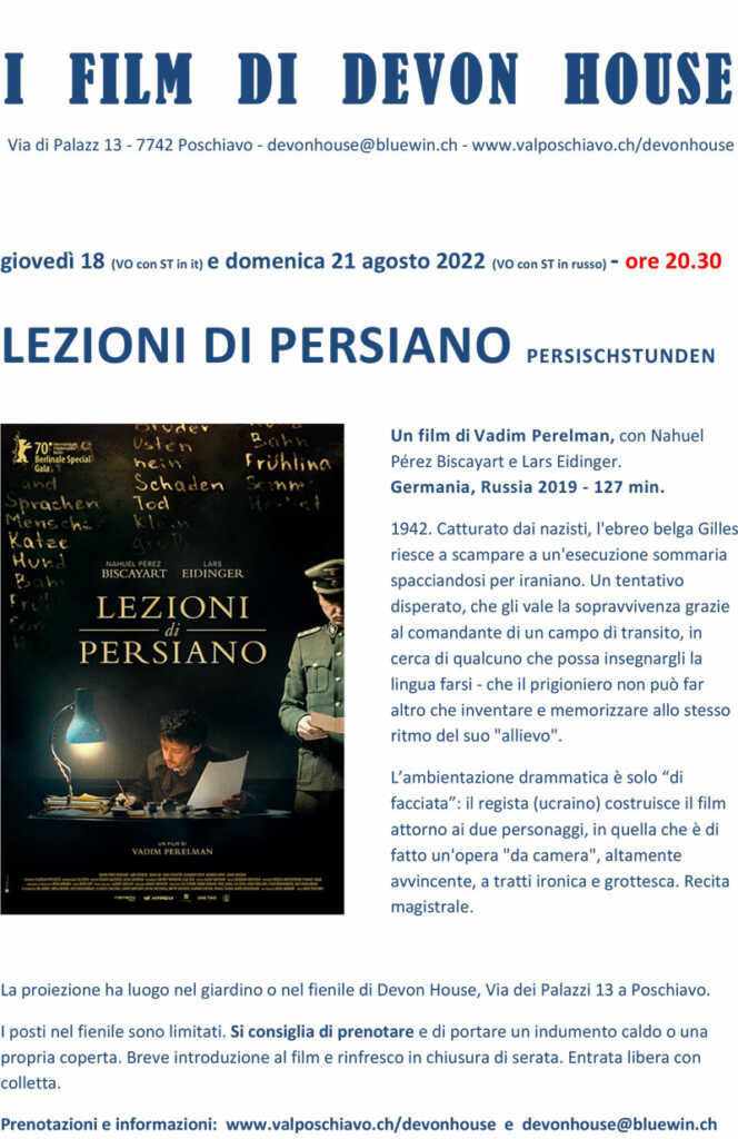 Alle ore 20.30, presso Devon House, il film “Lezioni di persiano” verrà proiettato in versione originale con sottotitoli in italiano e in russo, per facilitare la partecipazione anche alla comunità ucraina che attualmente vive in valle. La versione originale è in lingua tedesca, con pochi inserti in francese e italiano e, in questo caso, assolutamente preferibile alla versione doppiata.