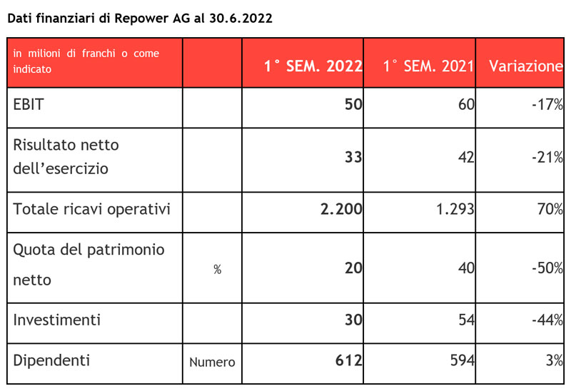 Repower ha conseguito nel primo semestre 2022 un EBIT di 50 milioni di franchi e un risultato netto dell’esercizio di 33 milioni di franchi. Tenuto conto delle importanti distorsioni che si registrano sui mercati energetici si tratta di un risultato operativo solido, da ricondurre soprattutto alle attività di trading in Svizzera. Il risultato semestrale 2022 si attesta leggermente al di sotto di quello precedente (EBIT: 60 mln CHF, utile netto: 33 mln CHF), che era però stato influenzato da effetti straordinari importanti. La domanda di energia di bilanciamento in Italia è invece diminuita. Di conseguenza, il contributo al risultato della centrale a ciclo combinato gas-vapore di Teverola è stato significativamente inferiore rispetto all’anno precedente.