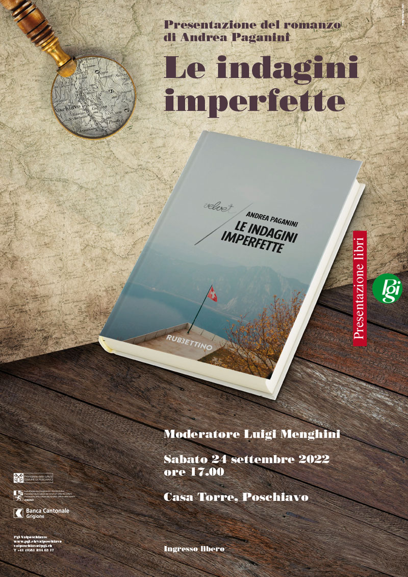 La Pgi Valposchiavo ha il piacere di presentare il primo romanzo di Andrea Paganini, “Le indagini imperfette”, e lo farà sabato 24 settembre 2022, alle ore 17 a Poschiavo presso Casa Torre. Sarà presente l’autore introdotto e intervistato da Luigi Menghini.