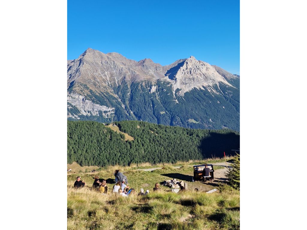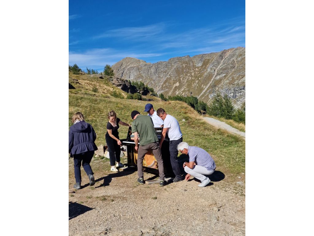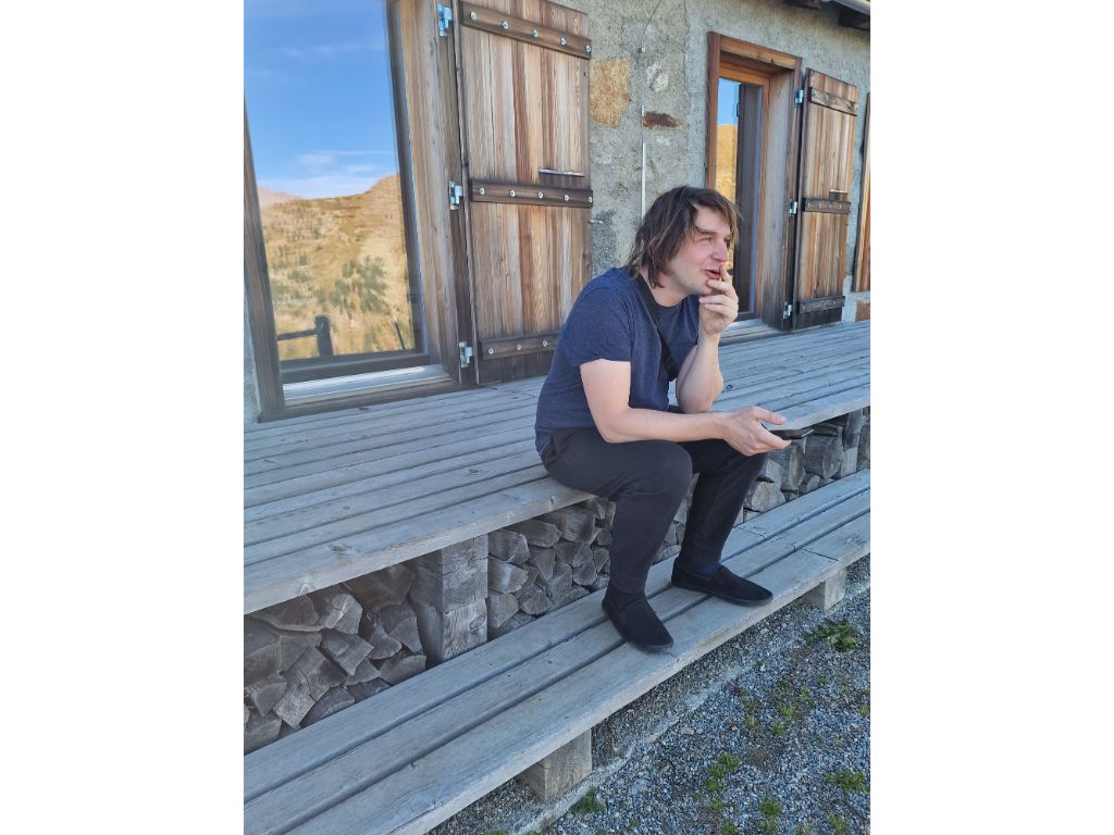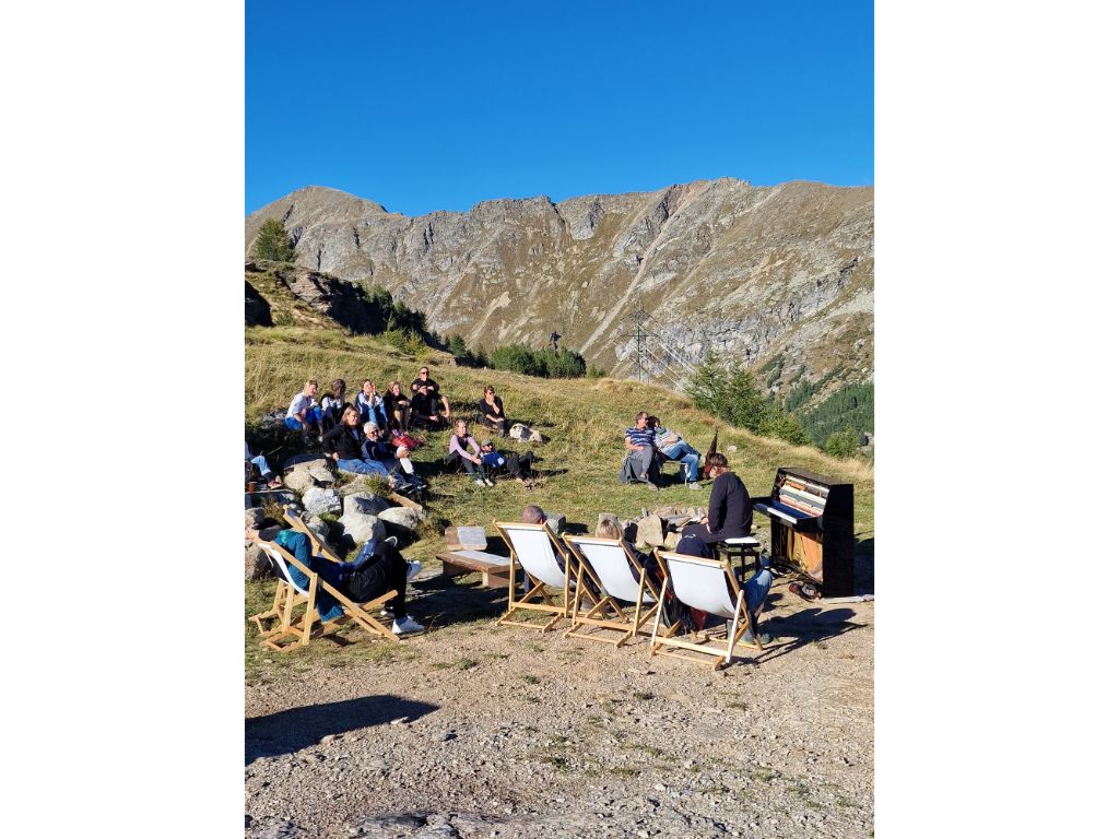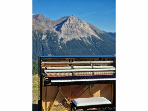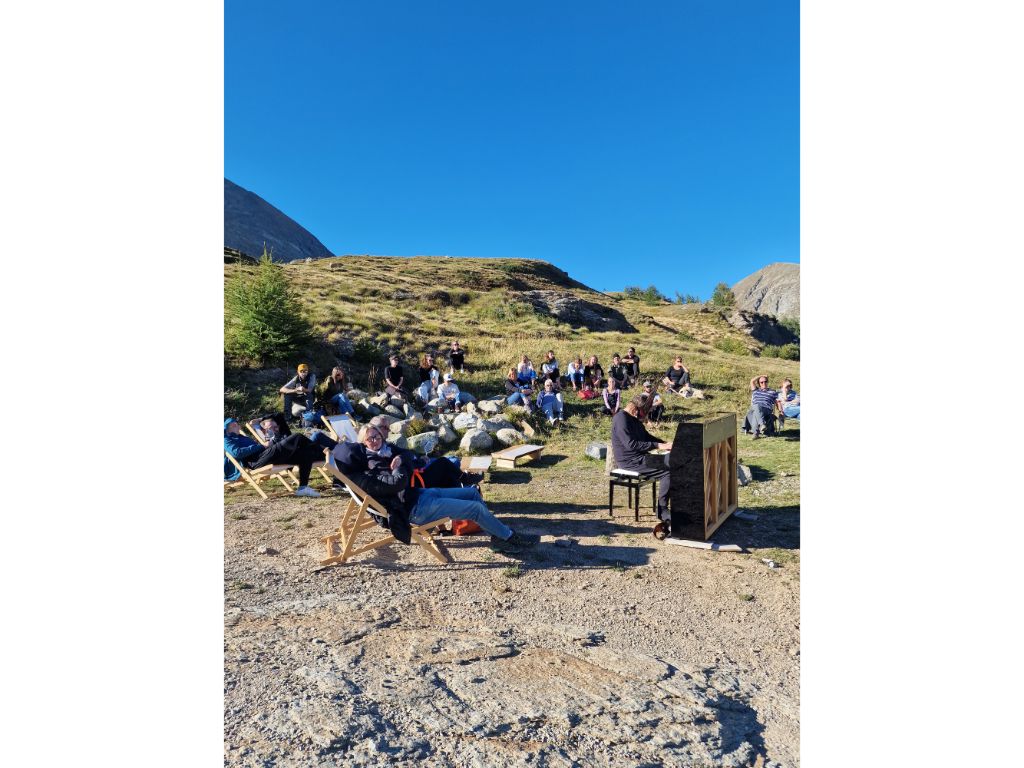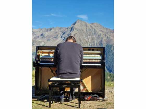 È stato un avvicinamento audace al concerto; sono infatti sceso da Ospizio Bernina in mountain bike, passando da quel palcoscenico naturale incredibile che è Pru dal Vent. E lì, nella nicchia di pascolo retrostante il Belvedere, l’inatteso. Quattro robusti aiutanti, coadiuvati dall’artista e dalle gerenti del locale, stavano piazzando e livellando il pianoforte. Che uno di loro fosse Lambert, il talentuoso musico venuto da lontano, l’ho scoperto più tardi.