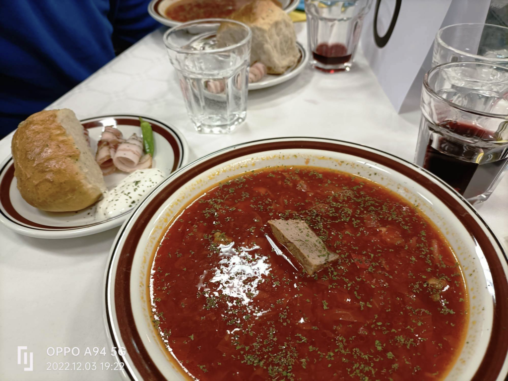 La cena è stata molto particolare e significativa, perché con il sottofondo di musica tradizionale del luogo sono stati serviti i piatti tipici della cucina ucraina, che hanno il sapore della gastronomia orientale: